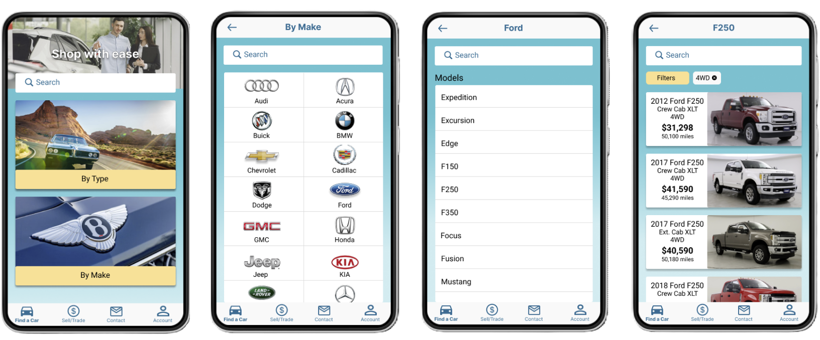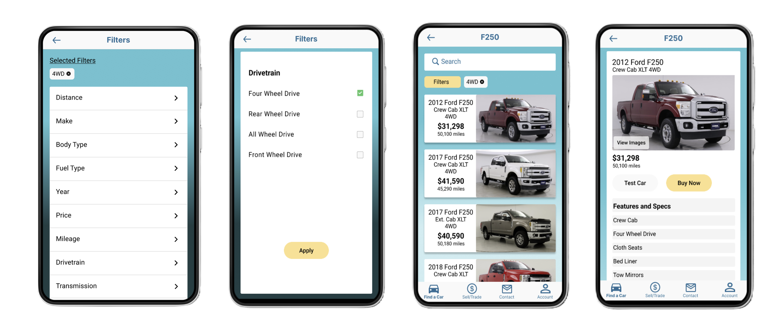 Using the app find a Ford F250 with four wheel drive: Selected by make. Used filters. Successful flow navigation.