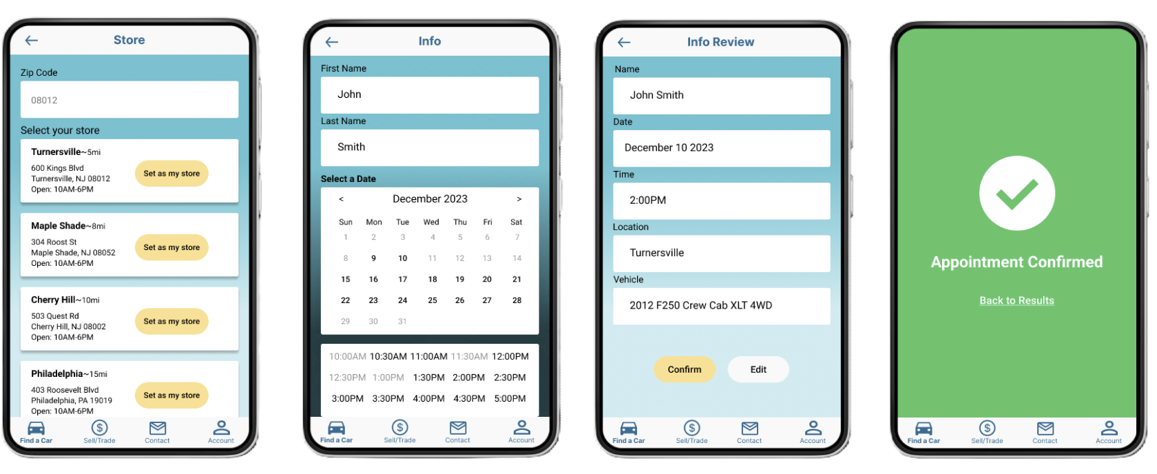 Now set an appointment to test the vehicle at the Turnersville store on the 10th at 2:00pm: User commented on maybe changing the wording on the set as my store button. Successful flow navigation.