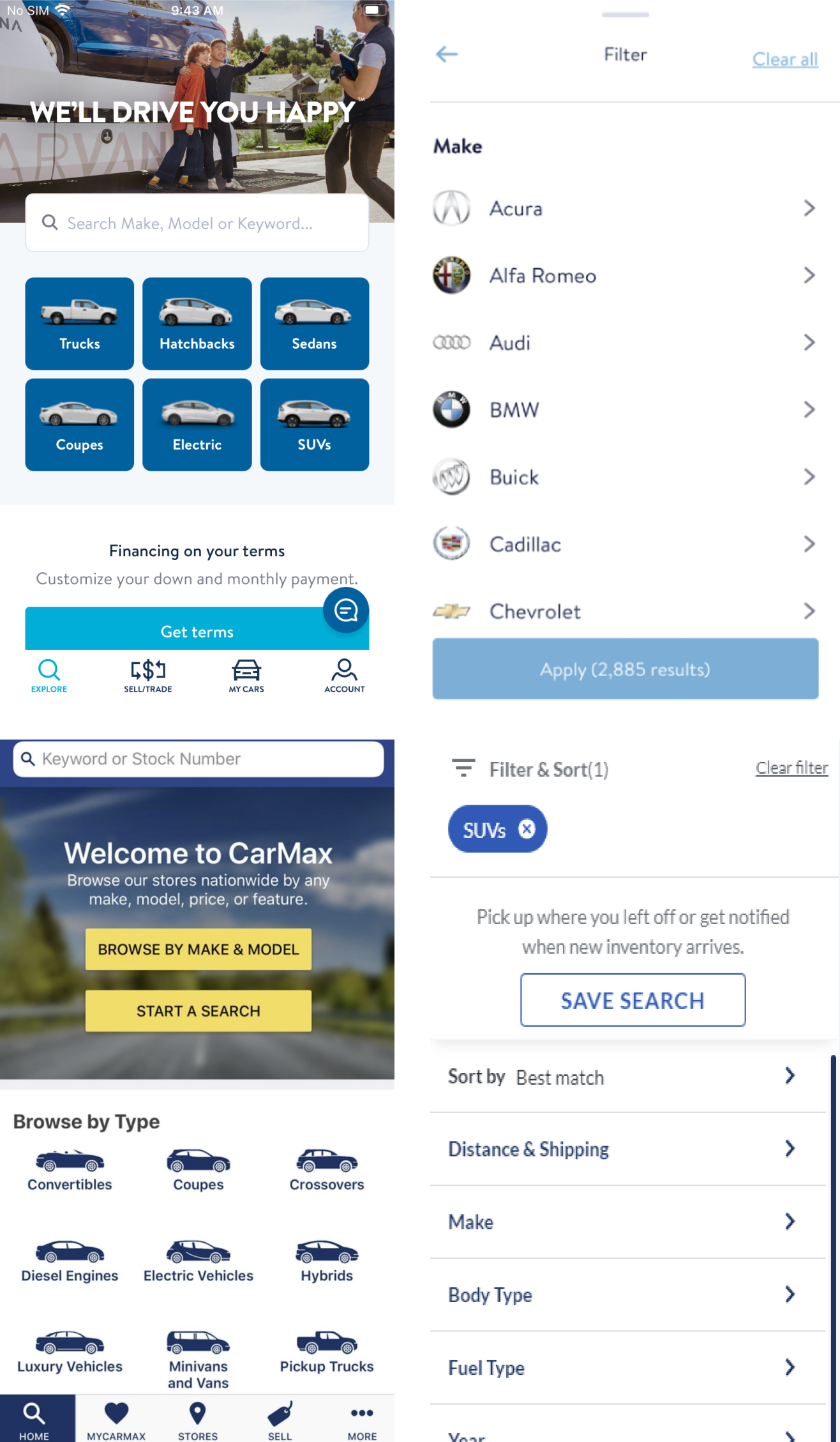 Using the app find an SUV: Initially tried to use by make. Reverted to by type. Successful flow navigation.