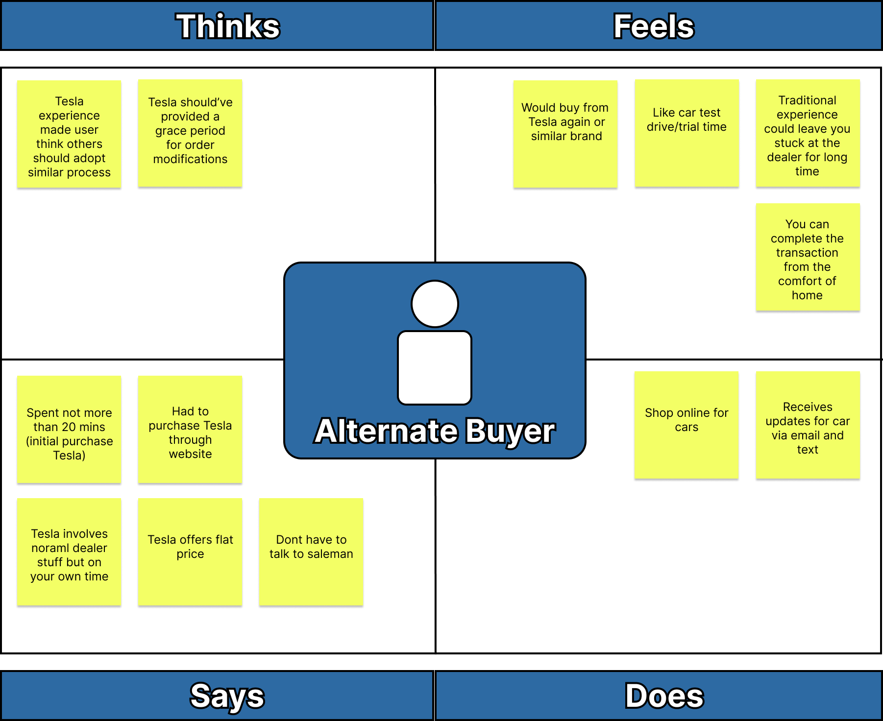 One user interview exposed the differences between the traditional dealership experience and the Tesla experience. “So there are still, you know, the normal dealer stuff, but you can do it on your own time spread out throughout months from the comfort of your own home…”