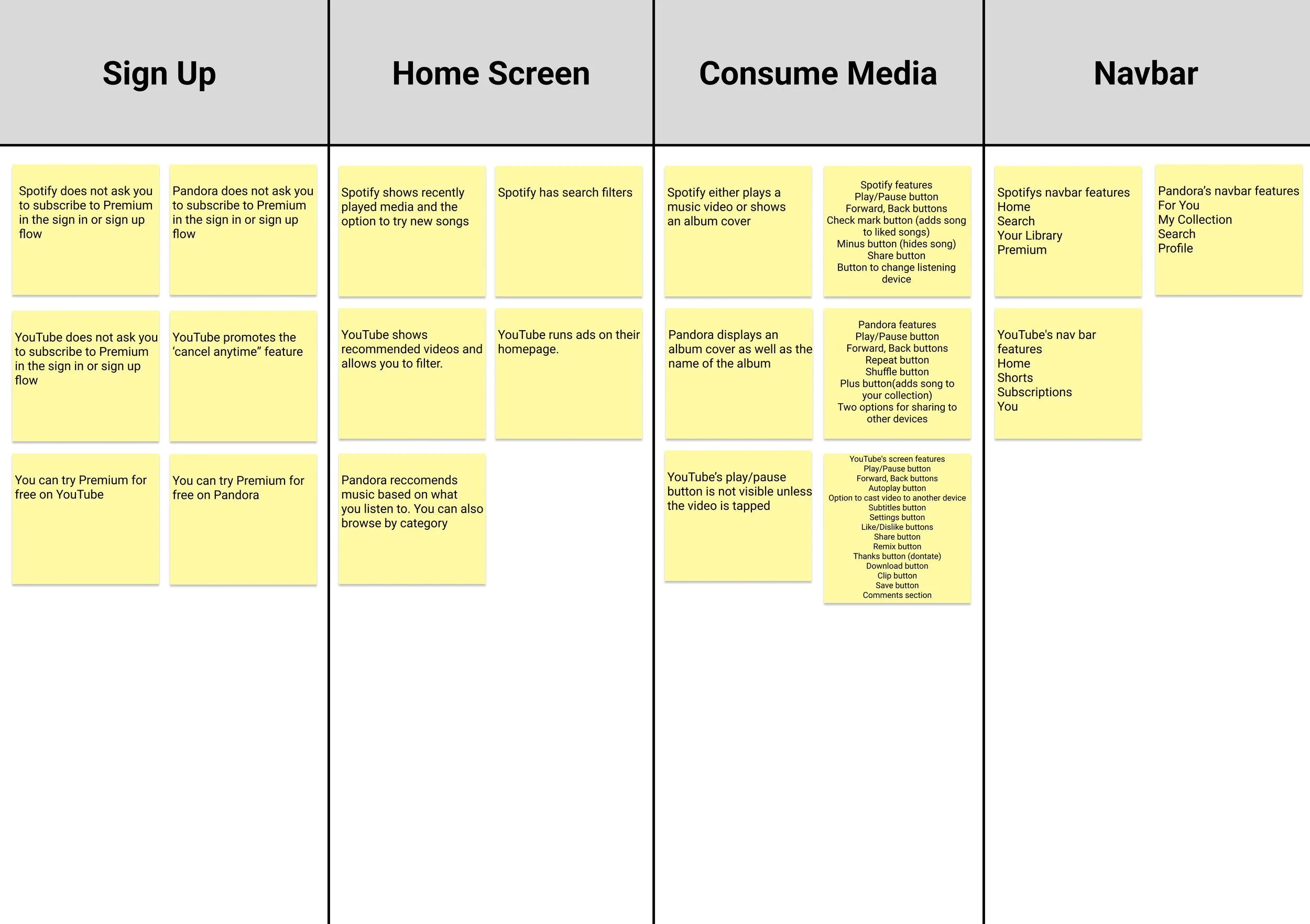 I chose to use competitive analysis for this project. I felt this method would help me understand best practices and common UI/UX patterns. I examined the big apps in this arena, Spotify, YouTube and Pandora.