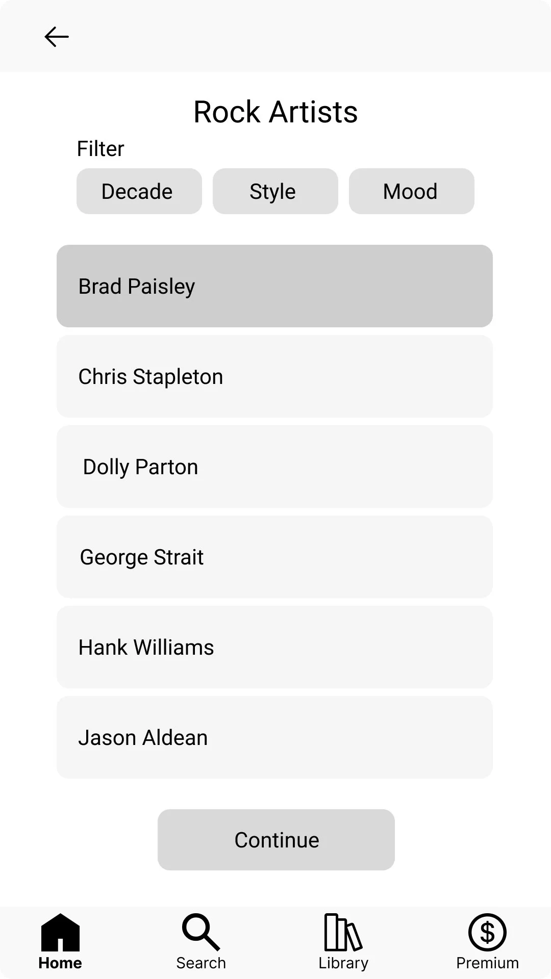 Customization Flow: Back on the home screen the user is told in this scenario they like country music and are asked for their next move. Everyone seemed to find the country tab with no issue. On the country music screen I told them they are interested in Brad Paisley, each user found Brad Paisley with no issue.