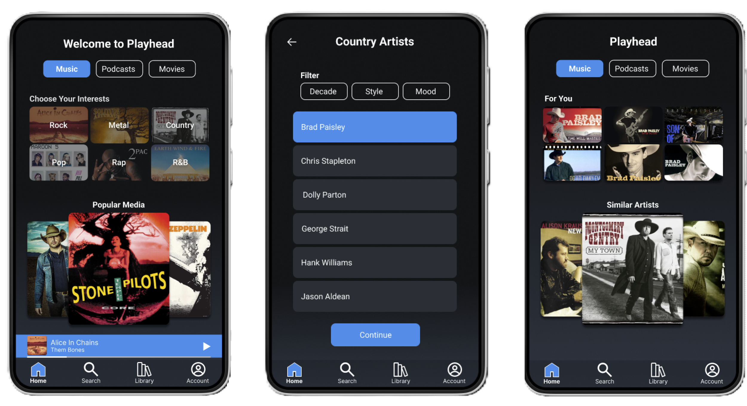 Customization Flow: The user is placed on the home screen. I present them with a scenario that they are interested in country music. I ask what their next move would be. Each user chose the country music tab. I then prompt them to chose Brad Paisley when the screen asks for their favorite artists. They navigated through with no problems.