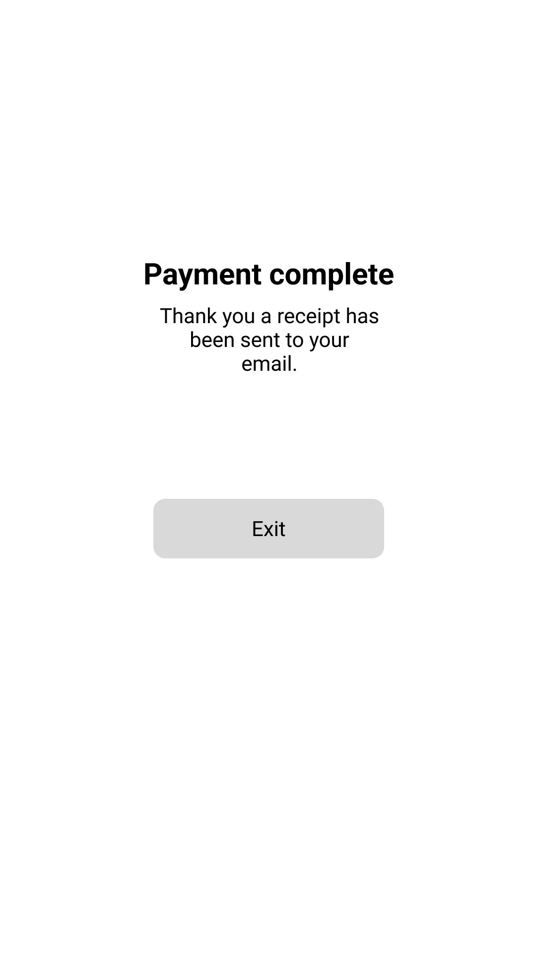 The user is taken to the payment complete screen and upon tapping ”exit” returns to the home screen